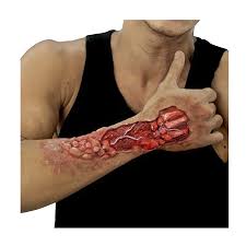 This injury sounds like a zombie-inflicted injury, but it is not. The Eaten Away Wound Prosthetic is really more of an industrial accident, featuring a gory and grotesque wound that has been corroded and burned by a chemical. What could cause an injury like this, you might ask? Many industrial solvents and chemicals could create chemical burns, and some, like powerful acids, possesses the ability to eat through even human flesh and bone, while leaving behind painful chemical burns as well. This injury features exposed bone along the top of the hand, as well as exposed muscle, tissue, and veins along the arm, surrounded by a bloody, burned patch of skin marred by pink chemical burns. This wound appliance is made entirely from high quality latex that has been hand-painted for detail, and it is designed to be easy to put on, requiring only a bit of spirit gum to adhere the prosthetic to the skin.