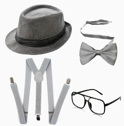 Includes: Hat, Bowtie, Suspenders, and Glasses