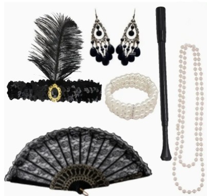 Includes: Cigarette Holder, Bracelet, Headband, Fan, Earings, and Necklace