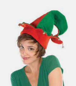 Festive red and green felt elf hat with bells on the crown tips and on the top.