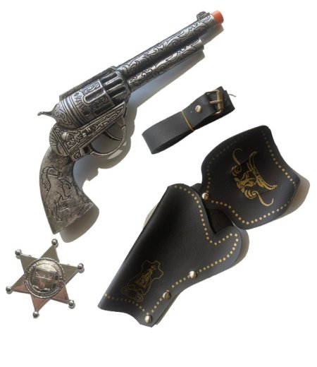 Includes: Plastic Silver Revolvor (colt 45), Black gun holster ans Sheriff Badge