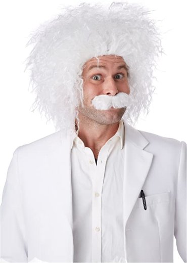 This hair is a look of genius! The E=MC2 is a white curly Einstein styled wig that comes with a stick on moustache. Moustache may require additional appropriate adhesive for extended wear.