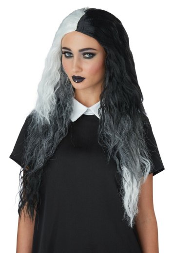 Don't get on my bad side. The Double Dare Wig is a long wavy black and white wig with a blended mid layer.