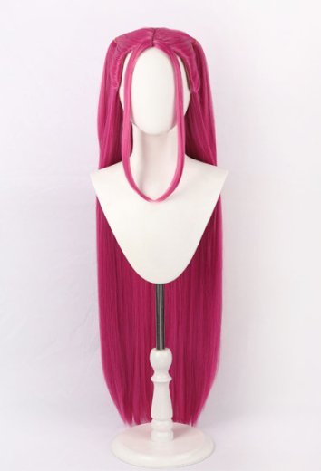 long fuschia colored hair styled in a sleek high half-up twin ponytail.
