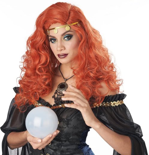 I look into the future that may be. The Mystified Wig is a long curly style with side swept bangs. It comes with a gold headband with coin like trim.
