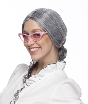 Grey wig, pulled back into a short ponytail