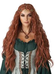 The Renaissance Maiden Wig in auburn is a long length wavy wig with parted bangs tied back into a pony tail.
