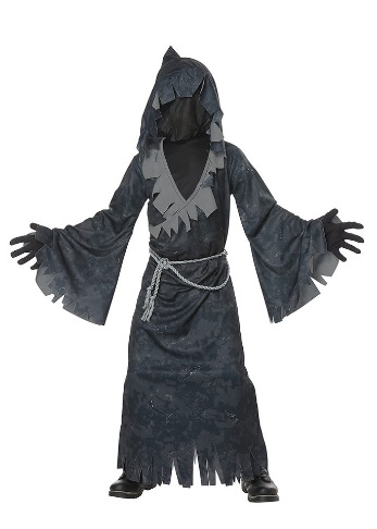 It hungers for more! The Soul Eater child costume is a distressed texture printed robe with an attached hood and see-through fabric face cover. It also includes a gray rope belt.