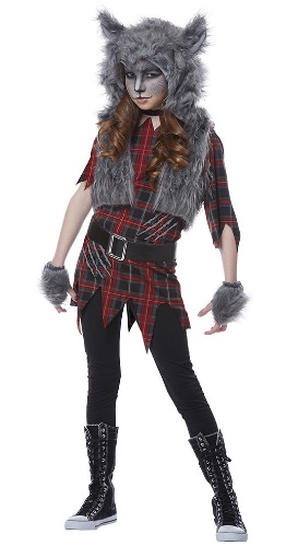 Includes: Vest with attached hood, Tunic top, Glovelettes and Belt with faux fur tail