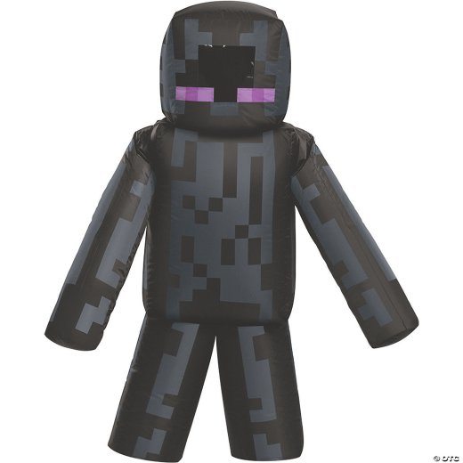 Become part of the mob from your favorite video game when you dress as this mysterious being. Creep out all your friends with this officially licensed Minecraft Inflatable Enderman suit. The Minecraft Inflatable Enderman Child Costume features a one-piece inflatable black pixel patterned suit with vibrant purple pixel eyes. Includes battery operated fan and a detailed instruction sheet for operation and care of the costume.