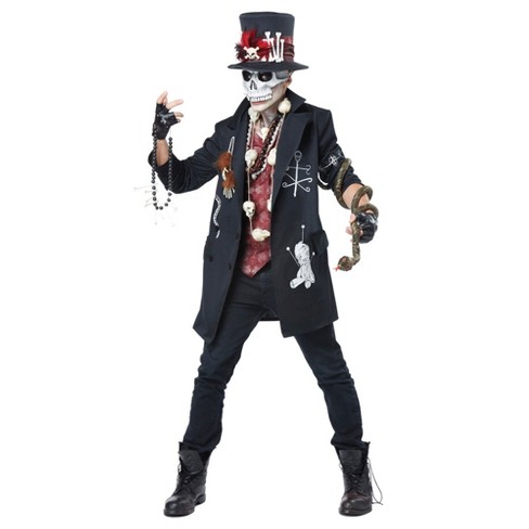 Includes: jacket with attached vest, a hat with bone and skull decoration, a half mask, and a pair of skeleton paws.