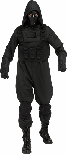 This costume includes a black hooded jumpsuit, a tactical-style vest, mask, arm bands, gloves, and knee guards. The jumpsuit is loose-fitting and made from lightweight material, giving it a slightly baggy look rather than a tailored one.