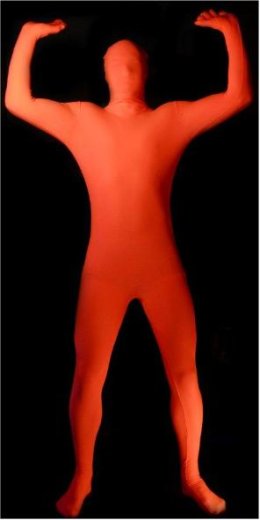 It is super easy to pull on this glow orange Morphsuit, it is a full body suit that fastens in the back with a zipper. It covers you from head to toe.