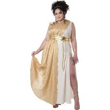 Gold goes well with a goddess such as I. The Golden Goddess women's toga includes a cream colored dress with one shoulder side decorated with gold fabric leaves, a gold fabric shoulder drape, a belt piece, a waist tie and a headband. Belt piece closes in back with Velcro.